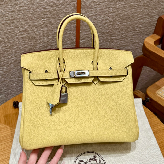 • 올수공 에르메스 버킨 25 1Z/Jaune Poussin 색상, 도고 가죽 실버 하드웨어