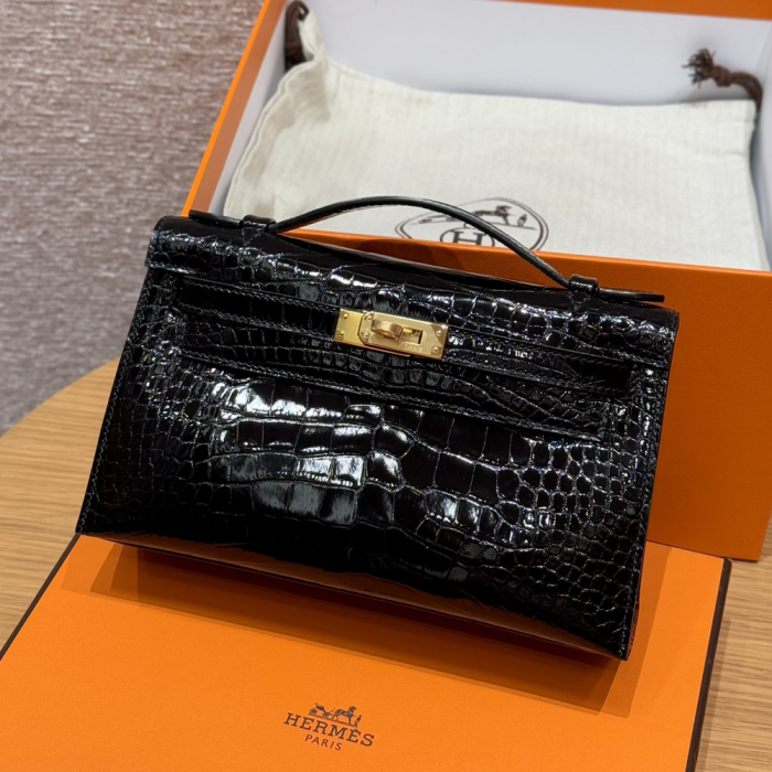 • 올수공 에르메스 미니 켈리 포쉐트 89/Noir 악어 가죽 골드 하드웨어