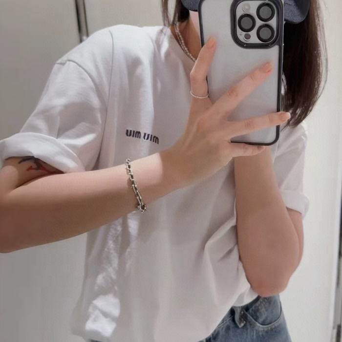 미우미우 베이직 자수 반팔 티셔츠 화이트 > 여성의류