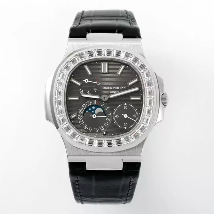 • PPF공장 파텍필립 노틸러스 문페이즈 블랙 다이얼 다이아 베젤 가죽밴드 5712G