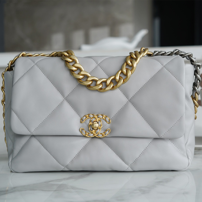 • 팬더샵 샤넬 19 미디움 핸드백 램스킨 & 골드 메탈 라이트 그레이