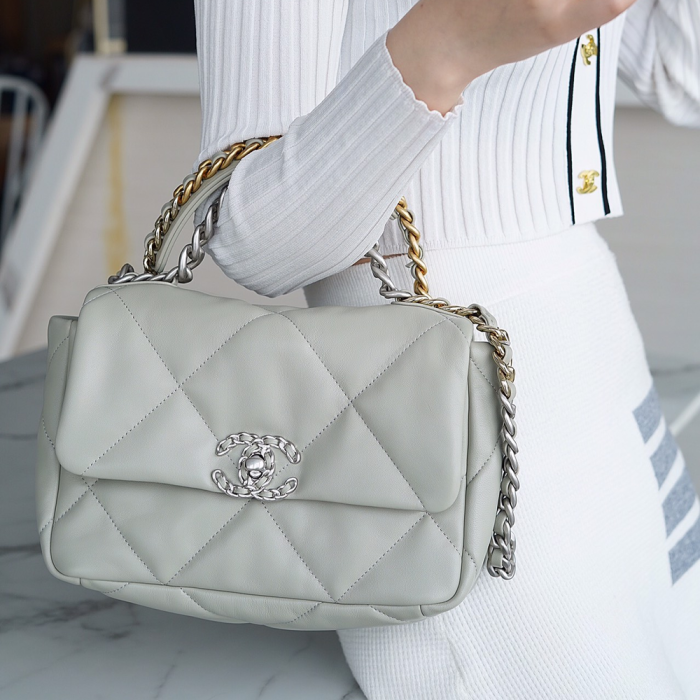 • 팬더샵 샤넬 19 미디움 핸드백 램스킨 & 실버 메탈 라이트 그레이