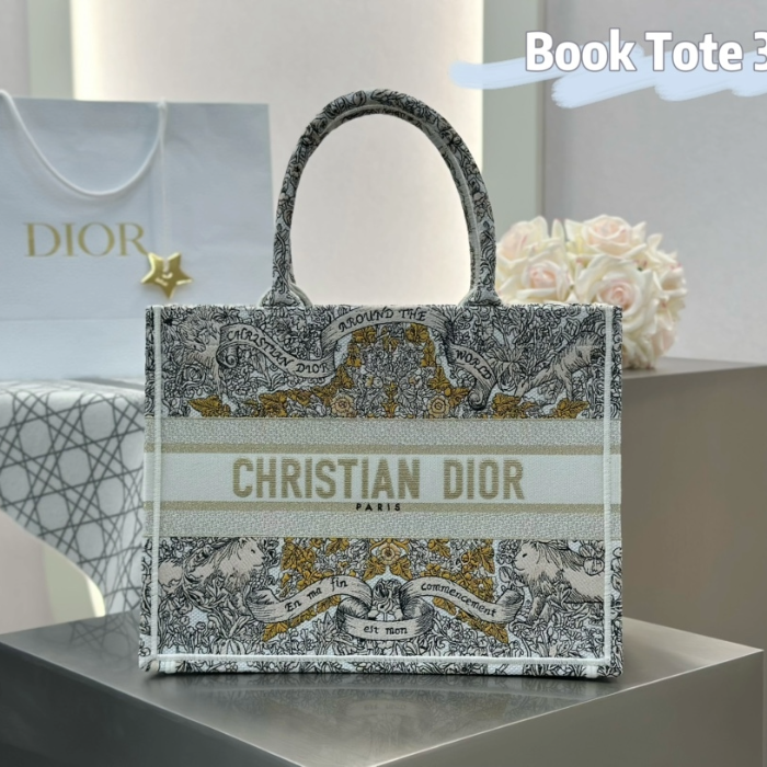 • 디올 미디엄 북 토트백 어라운드 더 월드 모티프 자수 라떼 골드