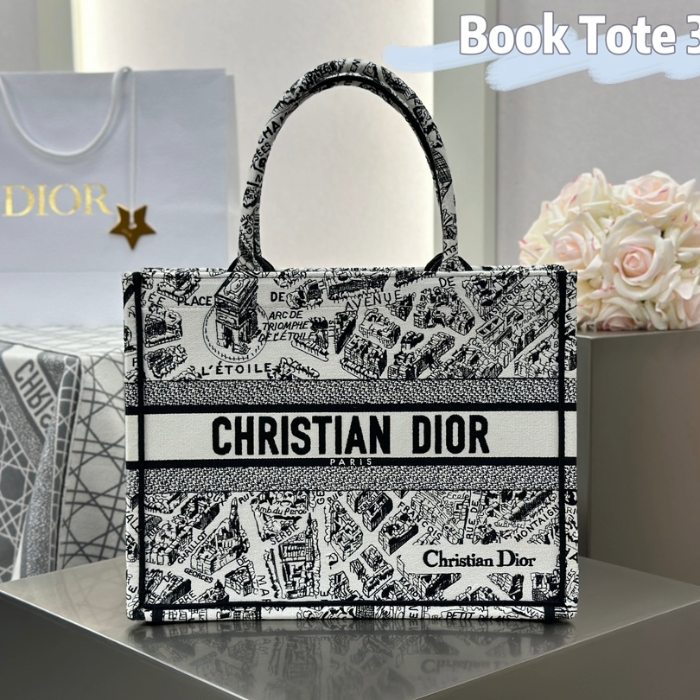 • 디올 미디엄 북 토트백 화이트 블랙 플랜 드 파리 자수