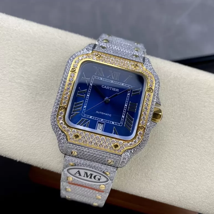 AMG공장 까르띠에 산토스 청판 다이얼 옐로우 골드 콤비 파베 세팅 > 남성 명품시계