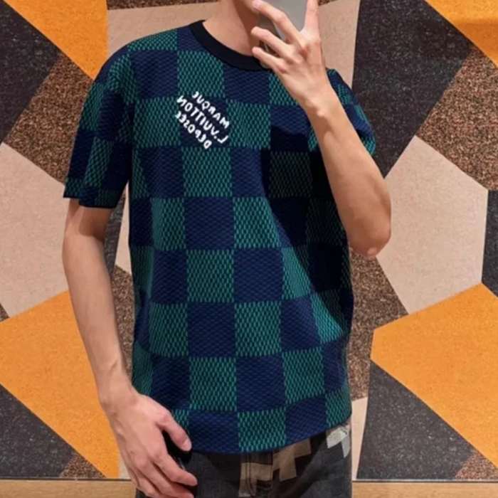 루이비통 그린 블루 다미에 슬리브 크루넥 니트 반팔 > 남성의류
